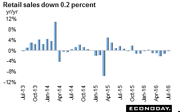 July retail sales retreated for the sixth month in seven by 0.2 percent. In June, sales dropped 1.3 percent. Among the subcategories, auto sales were down 0.2 percent after slipping 0.1 percent in June. Fuel sales dropped 11.9 percent after sinking 11.6 percent the month before. The sales decline for general merchandise moderated to 0.7 percent after sinking 3.3 percent in June. However, food & beverage sales were up 2.0 percent after increasing 0.7 percent and fabrics, apparel & accessories gained 1.3 percent and just 0.1 percent in June. Machinery & equipment advanced 0.8 percent after increasing 0.2 percent. The moderation in the decline in retail sales followed a similar pattern in the household spending report.