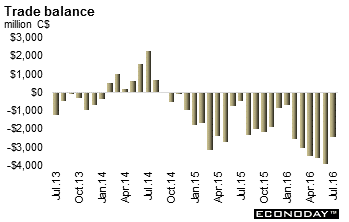 The July merchandise trade deficit narrowed to C$2.49 billion from a larger revised C$3.97 billion in June. The improvement in the headline reflected a 3.4 percent monthly rise in exports, helped to a limited extent by a 0.1 percent dip in imports. The bilateral surplus with the U.S. widened from C$1.43 billion to C$2.62 billion as sales across the border climbed 3.3 percent and purchases retreated 0.5 percent. The monthly increase in nominal exports was led by motor vehicle & parts (6.2 percent) and metal & non-metallic mineral products (9.7 percent). Aircraft & other transportation equipment & parts (9.6 percent), metal ores & non-metallic minerals (4.1 percent) and industrial machinery, equipment & parts (6.0 percent) also performed well. However, energy was down 0.8 percent. Imports were depressed by electronic & electrical equipment & parts (down 2.6 percent), consumer goods (down 2.0 percent) and industrial machinery, equipment & parts (down 1.4 percent).