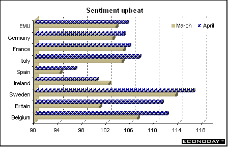 EU - April economic sentiment index reading climbed to 105.3 from March's reading of 103.6. Both industrial and consumer confidence improved. Industrial confidence improved to plus 1 from minus 1 while consumer confidence improved to minus 10 from minus 11. Services sentiment was up to 18 from March's reading of 15. Retail and construction sentiment were unchanged at minus 1 and minus 3 respectively.