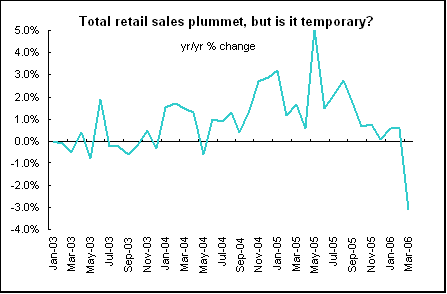 March retail sales were up 18.1 percent and 1 percent when compared with last year. Sales at large-scale retailers fell 0.6 percent on the year in March, after adjustment for the change in the number of stores.