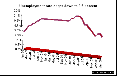 April unemployment rate edged downward to 11.3 percent from 11.4 percent in March. In the East, the unemployment rate declined to 17.9 percent from 18.1 percent while in the West, the rate crept down to 9.6 percent from 9.7 percent.