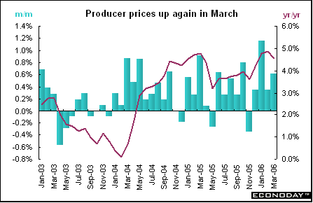 March producer price index was up 0.4 percent and 3.3 percent when compared with last year. Excluding food and energy, the PPI was up 0.2 percent and 1.3 percent on the year. Energy prices were up 0.6 percent and 11.2 percent on the year. Food and agriculture prices were up 0.5 percent and 2.1 percent on the year.