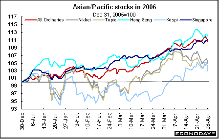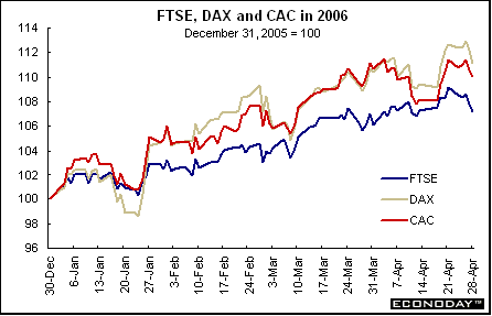 On the week, nine of 13 stock indexes followed here were down. And for the month of April, four indexes declined while the remaining nine were up. All indexes are positive so far in 2006.