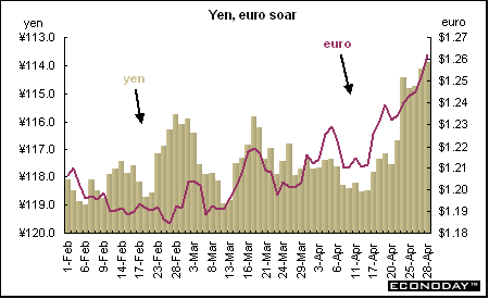 The May round of central bank meetings begins this week with meetings of the Reserve Bank of Australia, Bank of England and the European Central Bank. Analysts think that the RBA is considering an increase from its current 5.5 percent level given the unexpectedly large increase in consumer prices during the first quarter. The Bank of England is not expected to change its key interest rate from 4.5 percent at this meeting although the next move is expected to be an increase. ECB Governor Jean Claude Trichet went to great lengths after the April meeting to disabuse market players that a May increase was all but a fait accompli. So while analysts still think there are interest rate increases in the ECB's future, they are less sure of when they will occur.